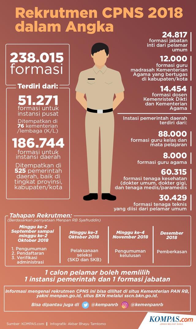 Total formasi yang tersedia untuk diperebutkan oleh pelamar berjumlah 238.015 yang terdiri dari 51.271 instansi pusat (76 kementerian/lembaga) dan 186.744 (525 instansi daerah).